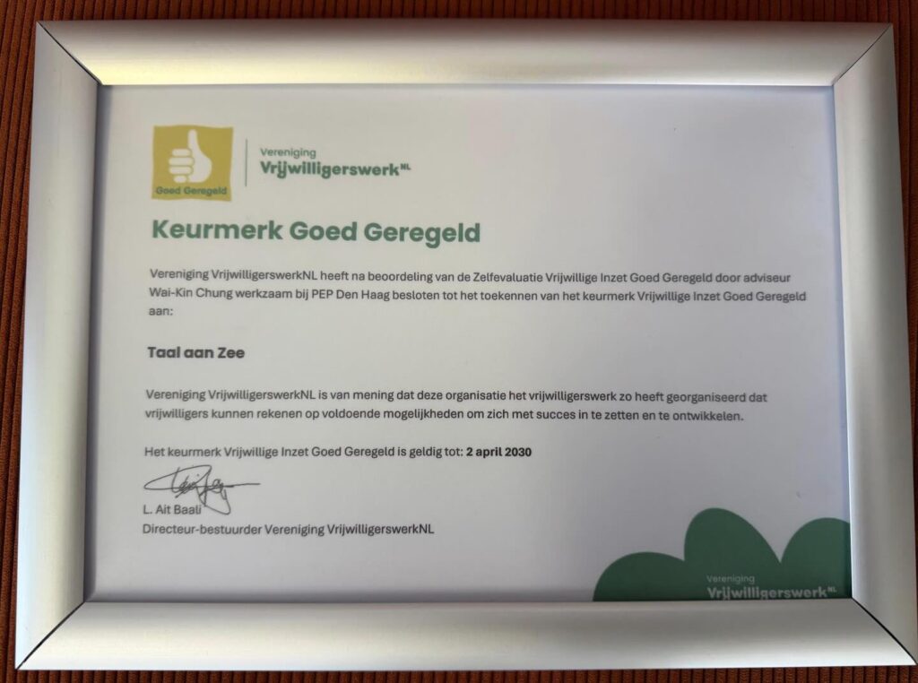 Het is officieel: het team van Taal aan Zee heeft voor de derde keer het keurmerk ‘Vrijwillige Inzet Goed Geregeld’ behaald! Een mijlpaal waar we ontzettend trots op zijn.